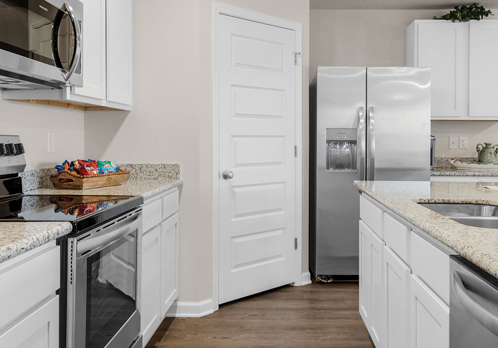 Our custom-crafted homes feature white shaker-style cabinetry and granite countertops. Each luxury leased home includes stainless steel appliances, full-sized washers and dryers, and wood-style plank flooring throughout. Whether you want extra space for crafting, getting a workout in, or working from home, Dixon Preserve provides the space you need with all of the extras you deserve.